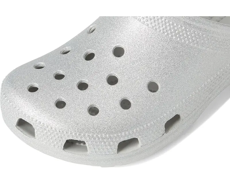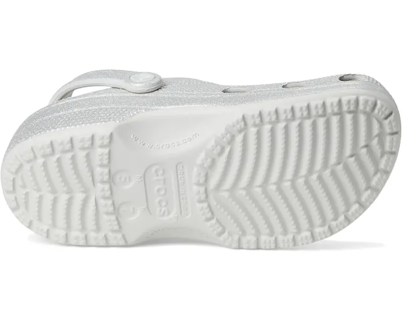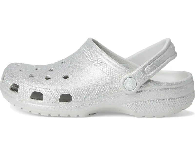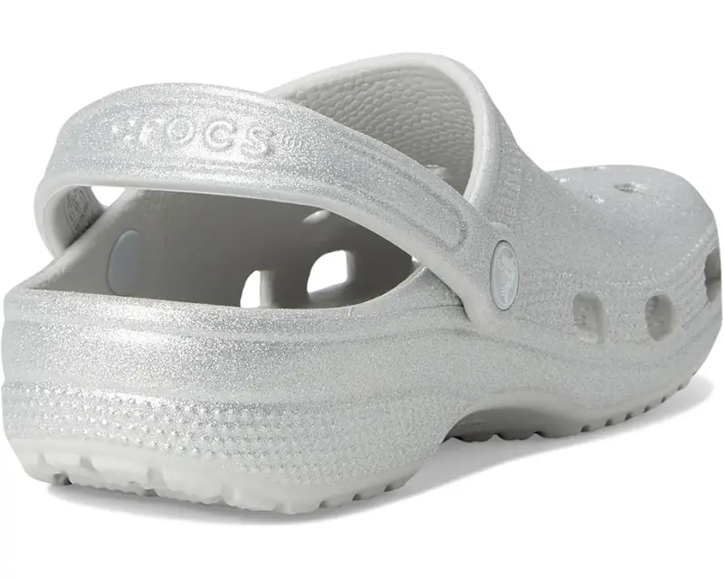 • Let the fun begin in the Crocs® Classic Clog – Glitter. Croslite™ uppers are available in a variety of colors in patterns in a slip-on design with an adjustable heel strap and ventilation ports for breathability.